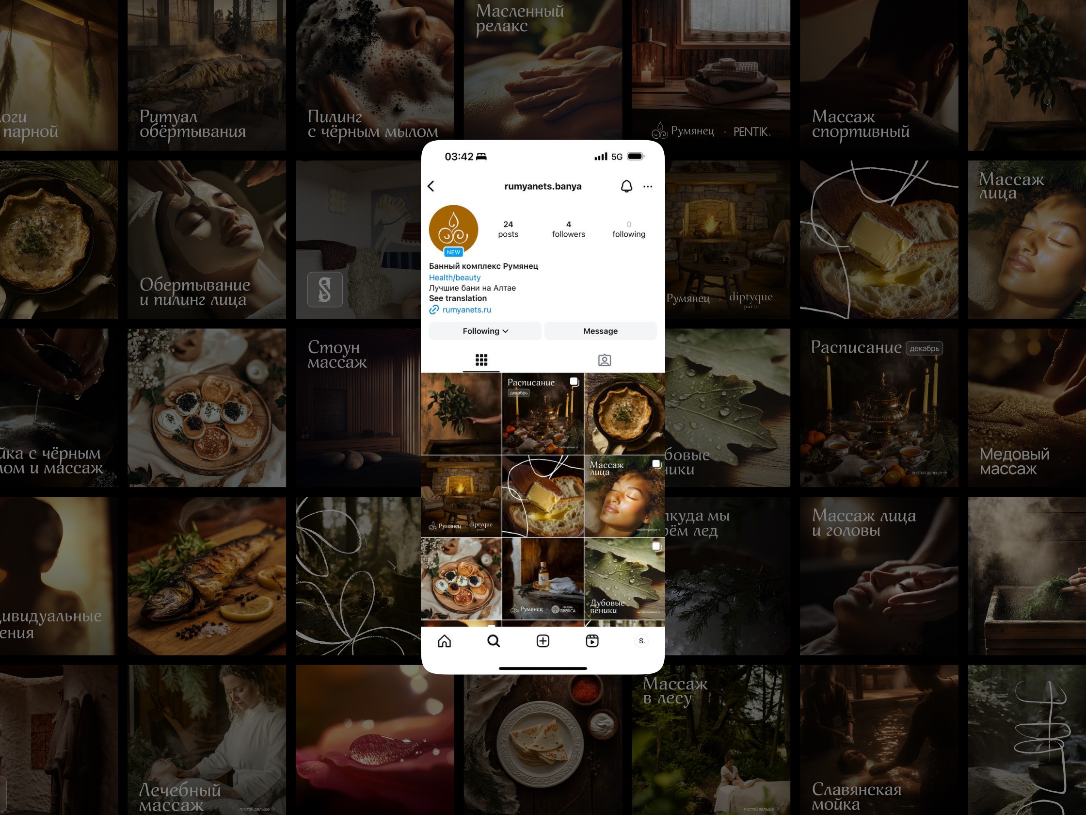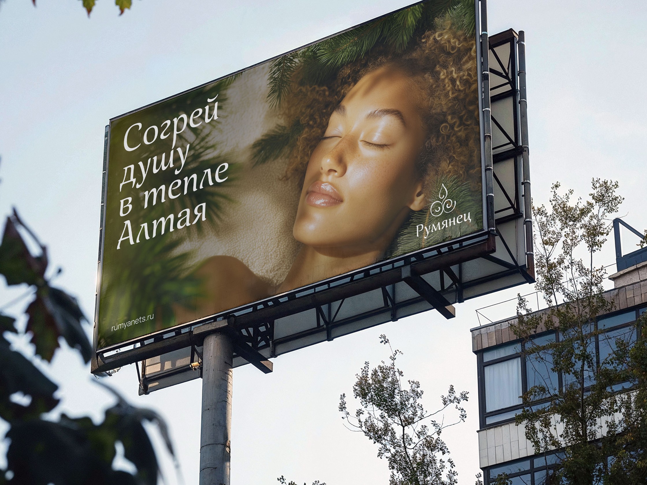 Rumyanets (“blushy cheeks” in Russian) is a bath complex in Altai that fuses Russian, Altai, and modern bathing traditions, each represented by its own bathhouse with authentic materials, rituals, and architecture. The challenge was to honor these traditions while creating a unified identity that conveyed authenticity, relaxation, and connection to nature. I developed a comprehensive branding system with a logo inspired by natural elements, an earth-toned palette, and visuals reflecting each bathhouse’s essence, along with verbal identity, product packaging, social media assets, merchandise, and ongoing branded materials to enhance the customer experience.