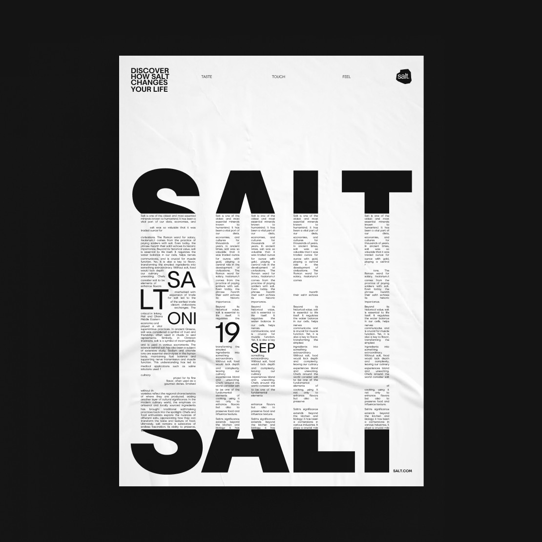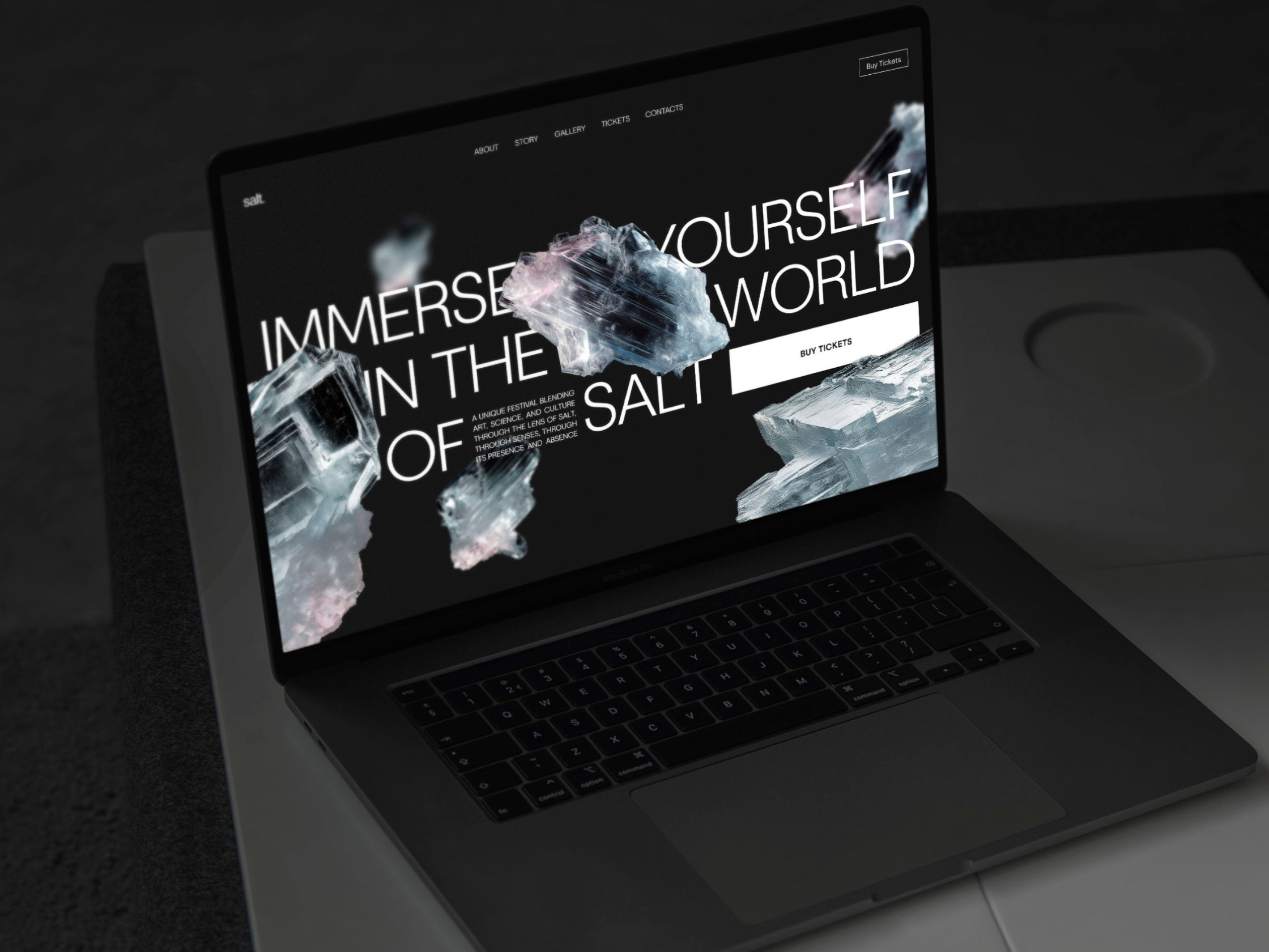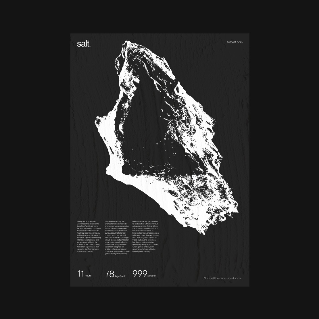 As part of a university project, I developed a festival identity inspired by the cultural, artistic, and scientific impact of salt, focusing on its unique properties of crystallization, structure, and transformation. I created a typographic system and full visual identity—including a responsive website and print/digital materials—that combined sharp geometric forms with soft organic shapes, reflecting salt’s dual nature as both solid and dissolvable.